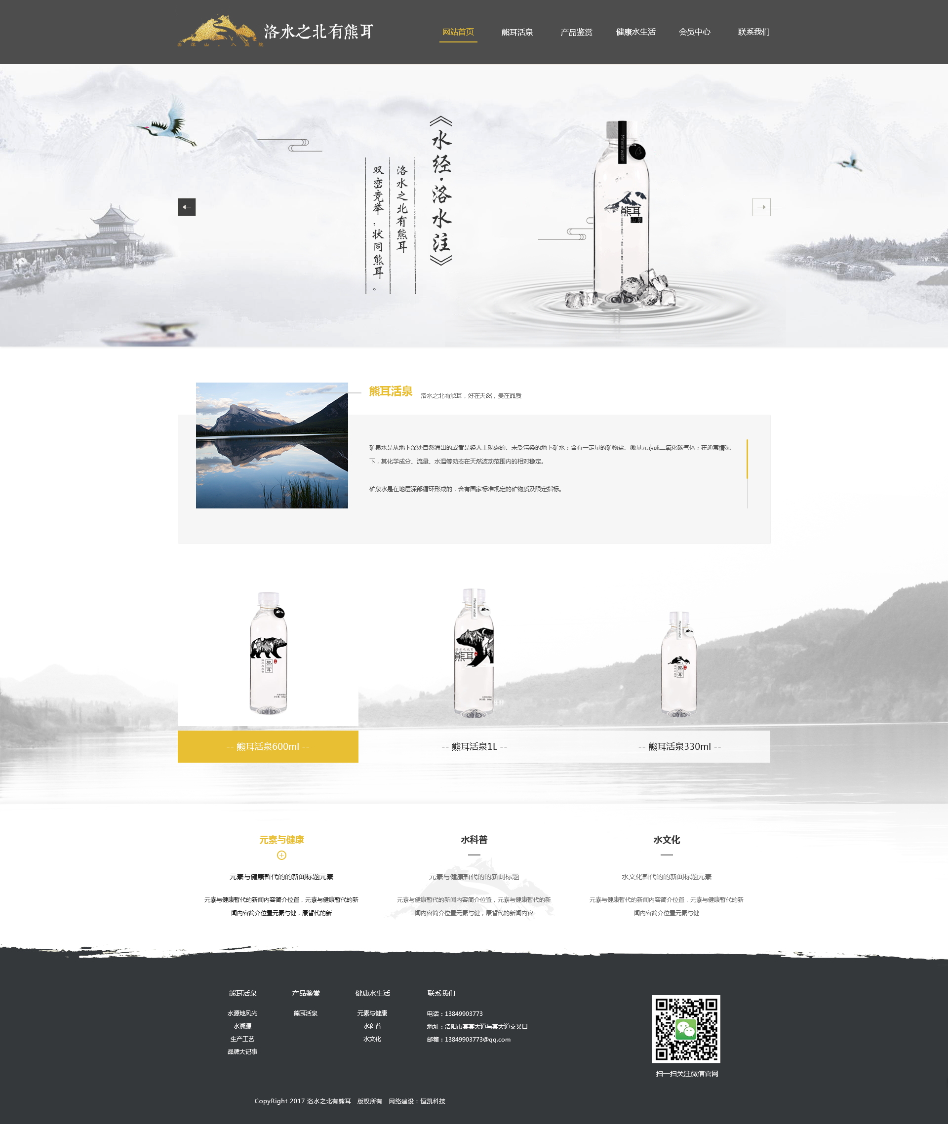 熊耳活泉——洛水之北有熊耳,好在天然,貴在品質(zhì)。礦泉水是從地下深處自然涌出的或者是經(jīng)人工揭露的、未受污染的地下礦水;含有一定量的礦物鹽、微量元素或二氧化碳?xì)怏w。