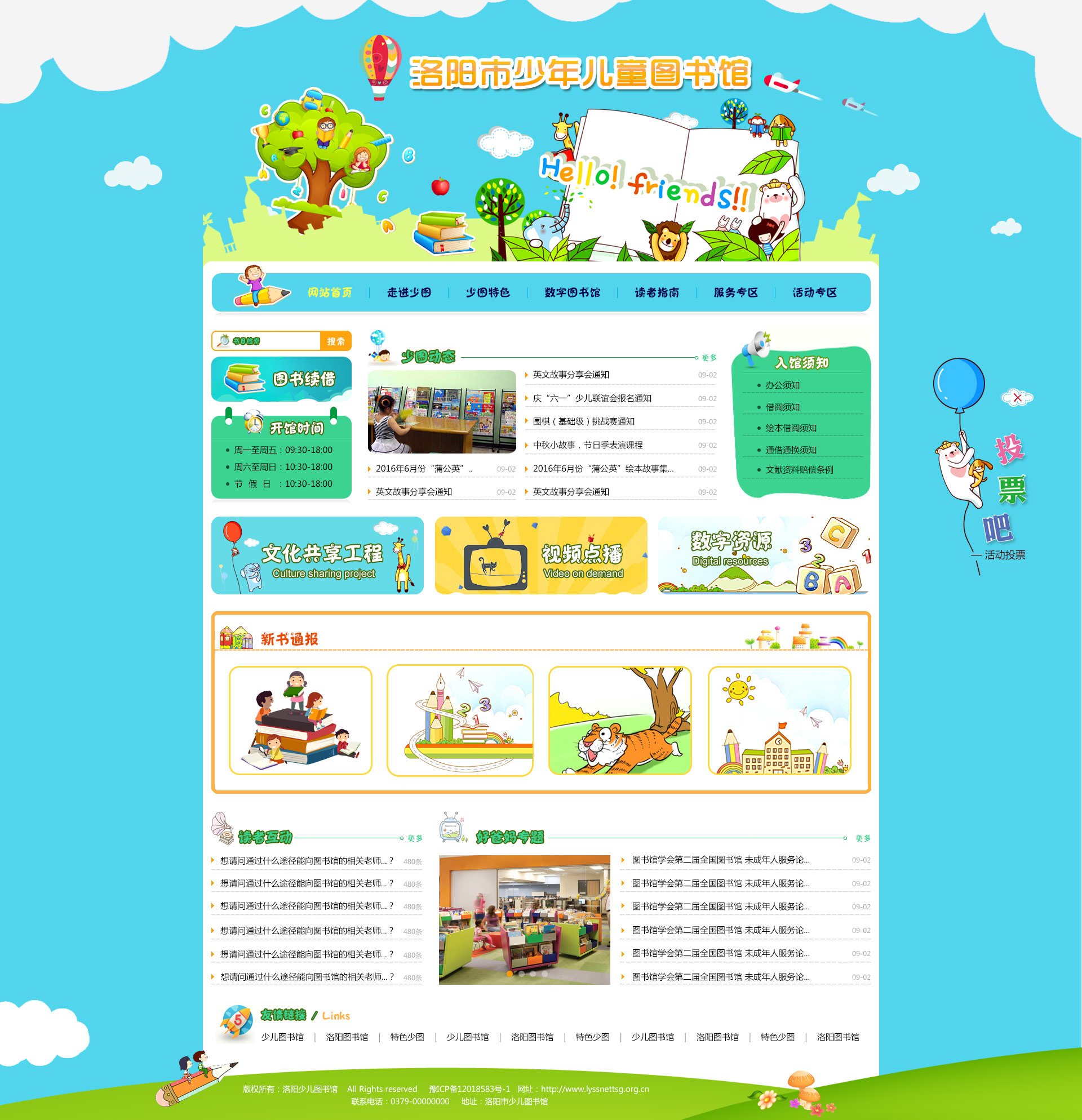 洛陽(yáng)市少年兒童圖書(shū)館位于洛陽(yáng)市澗西區(qū)七里河暢元大廈,于2011年建館,館舍使用面積近700平方米,是洛陽(yáng)市唯一一所專門(mén)為城鄉(xiāng)少年兒童(0-18歲)、家長(zhǎng)和少兒教育工作者提供文獻(xiàn)書(shū)刊閱讀和知識(shí)咨詢服務(wù)的公益文化服務(wù)機(jī)構(gòu)。