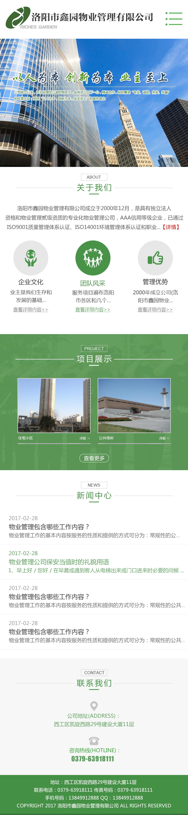 洛陽市鑫園物業(yè)管理有限公司成立于2000年12月,是具有獨立法人資格和物業(yè)管理貳級資質(zhì)的專業(yè)化物業(yè)管理公司,AAA信用等級企業(yè),已通過ISO9001質(zhì)量管理體系認(rèn)證、ISO14001環(huán)境管理體系認(rèn)證和職業(yè)健康安全管理體系認(rèn)證。